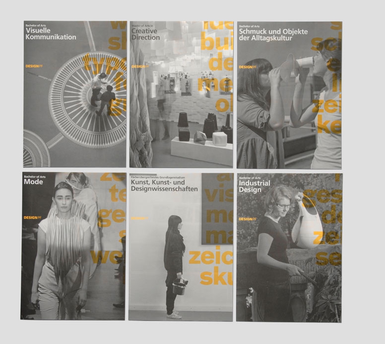 The brochures for the different departments give an insight in the atmosphere, process and events at the School of Design in Pforzheim. Two sheets of paper folded into each other create contrasts between work in process and final results through haptic (paper), colour (b/w vs. cmyk) and image concept (random vs. directed).